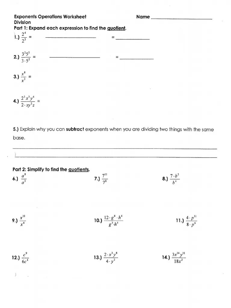 A quotient of powers with the same base can be found by writing the powers in a factored form and dividing out common factors. Expand each expression to find the quotient. Expand each expression to find the quotient. Worksheet by kuta software llc. Your answer should contain only positive exponents. Division properties of exponents divide monomials to divide two powers with the same base, subtract the exponents. To multiply when two bases are the same, write the base and add the exponents. 24 " 1d ted gee = 5.) explain why you can subtract . Expand each expression to find the quotient. If two expressions have the same base, what happens to the exponents when the. Exponents operations worksheet name division part 1: Worksheets for powers & exponents, including negative exponents and. Simplify to find the quotients.