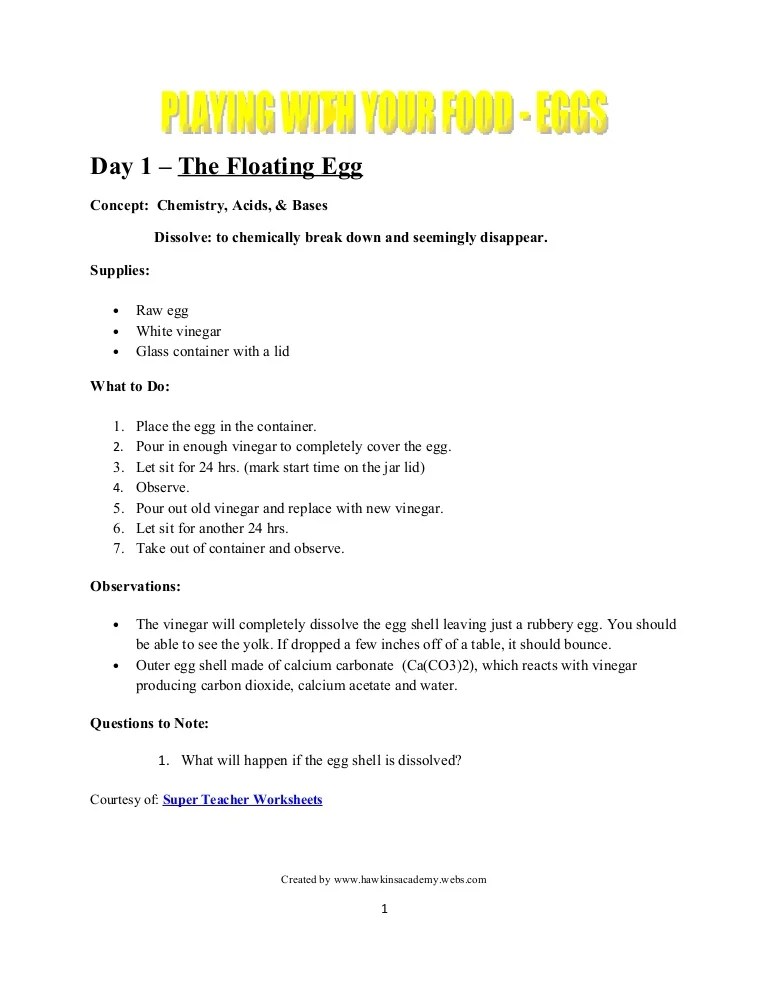 This rubber egg experiment is a classic science activity! After 24 more hours have gone by, you will notice that the egg shell will have completely . But if you don't have chickens or ducks of your own, where can you get fertile eggs? Then fill the glass with white vinegar until the egg is completely submerged. Simply use vinegar to dissolve the eggshell and dye with food colouring. The egg in vinegar experiment can be used as a dental health activity to show your child how acid interacts with calcium to cause tooth decay. A fantastic bouncing egg experiment worksheet suitable for use in the kindergarten! Looking for free easter worksheets or educational easter activities? If you haven't downloaded the free worksheet that goes with this egg experiment with vinegar, go ahead and put in your email in the . Explore chemistry and osmosis by making a rubber egg and turning it into a bouncing egg. Hold on to your eggs because this science experiment might have your kids. How to make a bouncy egg. With the popularity of online sales, it's now easier than ever to find ha.